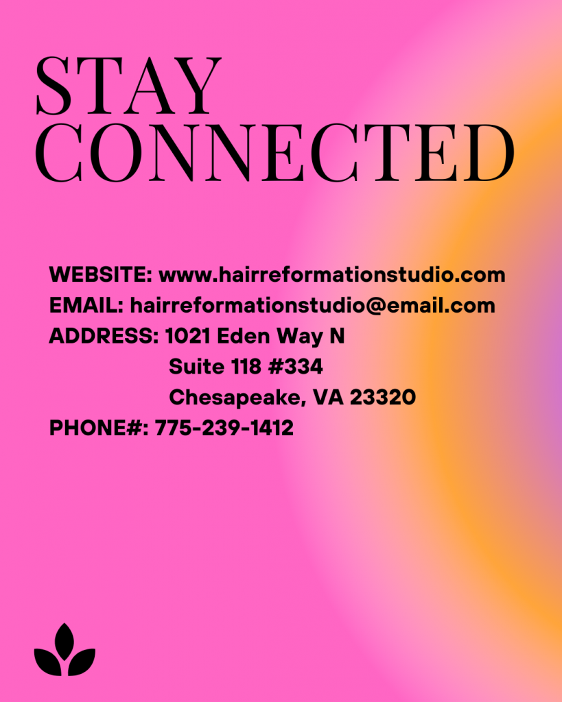 Please contact me at 775-239-1412 or email me: hairreformationstudio@email.com for your appointment!  NOTE FOR HAIR LOSS PATIENTS ONLY: If it’s in regards to a hair loss appointment following this conversation all clients will be offered an initial consultation FREE in the month of MAY.  A consultation form will be emailed to you and is expected to be completed prior to your appointment.  This consultation appointment will give me, your hair loss practitioner, a chance to meet with you confidentially to help define what your areas of concern are, what issues may be going on, full hair and scalp analysis and decide whether a multi-therapeutic program is the right course of action for you at that time.  If, together with your hair loss practitioner you decide to proceed, you will be offered a series of mutually agreed appointments.  NOTE FOR ITIP AND TAPE-IN EXTENSION CLIENTS ONLY:  A consultation is required during your first appointment so we can decide on length, density and color and a deposit is required to proceed with appointment.  ALL OTHER HAIR APPOINTMENTS NO DEPOSIT NEEDED!  Thanks I look forward to speaking with you!